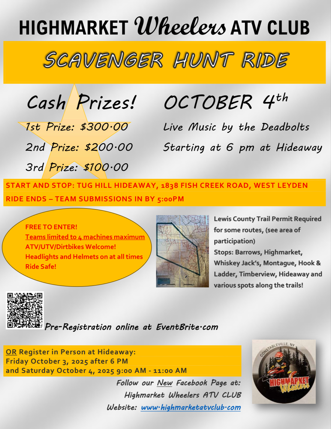 For more detailed information on this event please check out our website Highmarket Wheelers ATV Club. Hope to see you there!